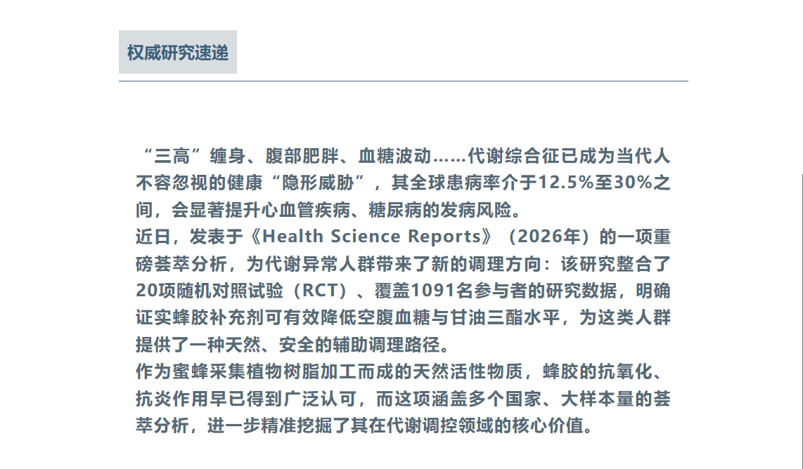蜂膠科研再出新成果!20 項臨床試驗證實調控血糖血脂精準,代謝綜合征人群新福音